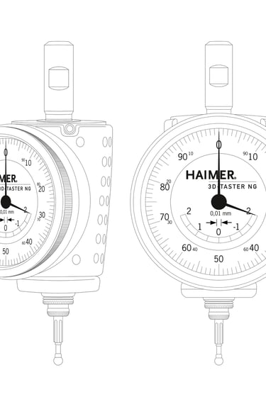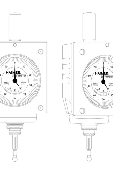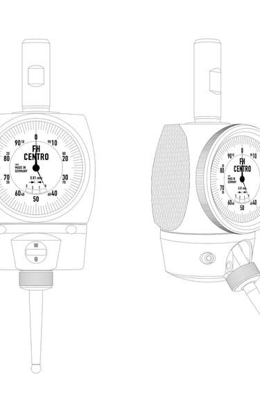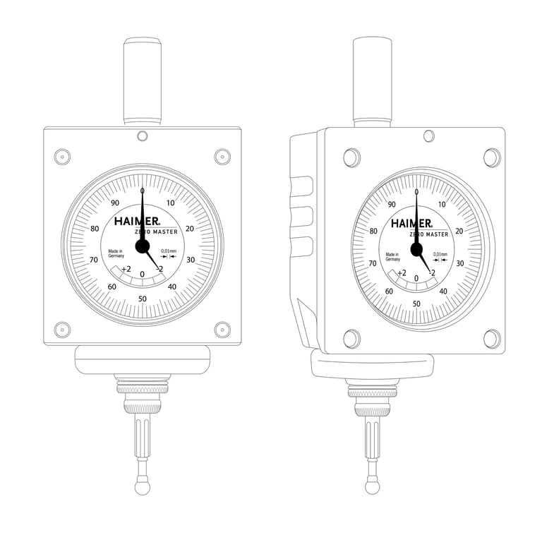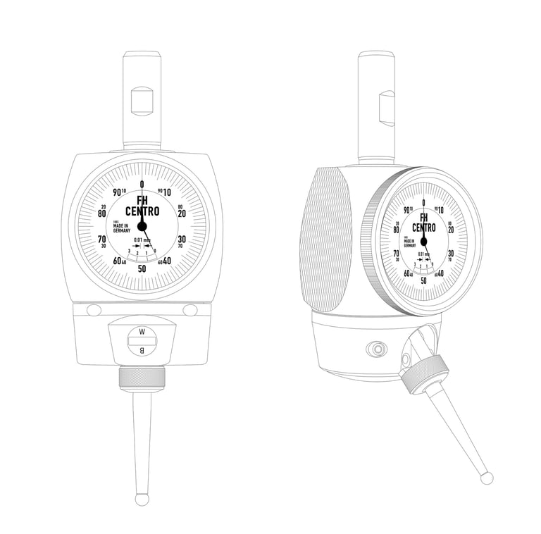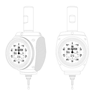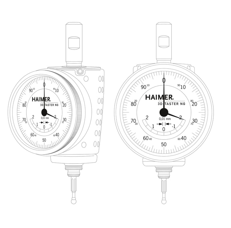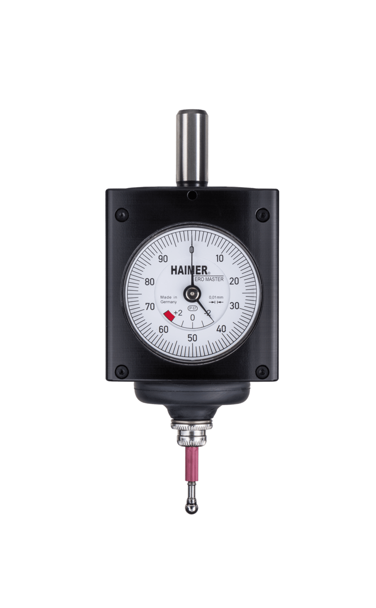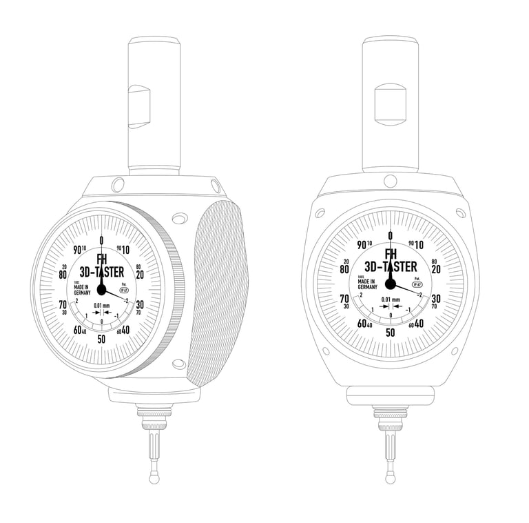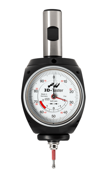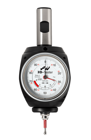The 3D-Sensor is clamped into a tool holder and inserted into a milling spindle. Once clamped into the machine spindle, the run-out (T.I.R) is fully adjustable to Zero. Then, you are able to find exact positioning of the spindle axis on the edges of the workpiece. This allows for zeros to be set and the length to be measured quickly and easily. You may approach in any direction (X-, Y-, Z- axis – hence the name „3D-Sensor“). When the dial gage shows zero, the spindle axis is exactly on the workpiece edge.