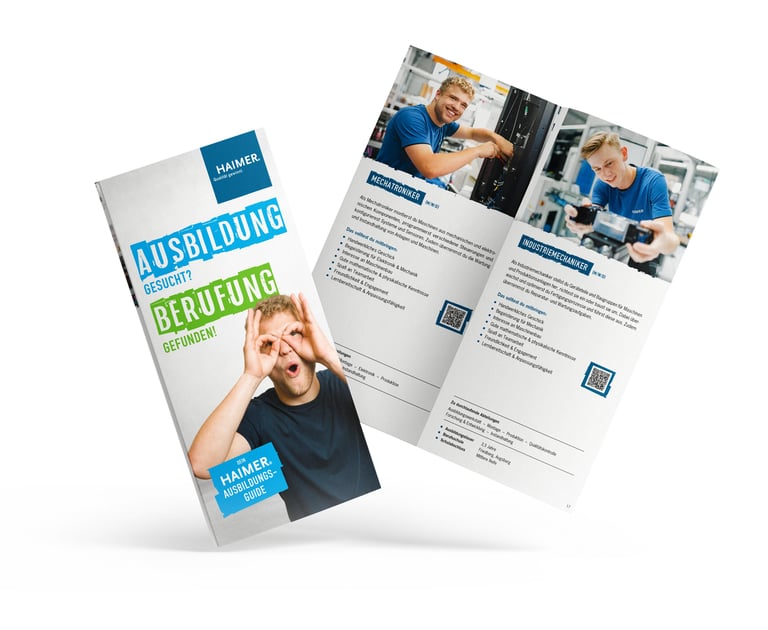 Haimer GmbH has been producing this brochure since 2018 and has been distributing it in large quantities at schools, educational institutions, job fairs, and other venues. It contains general information about apprenticeships at the company, tips for applicants, interesting facts, and detailed information about all ten apprenticeship programs at Haimer.