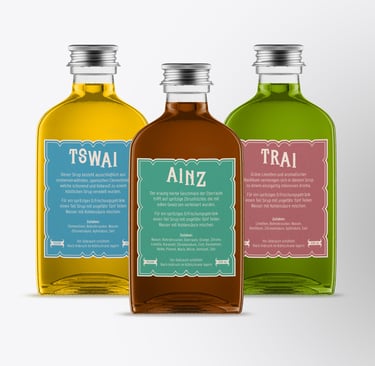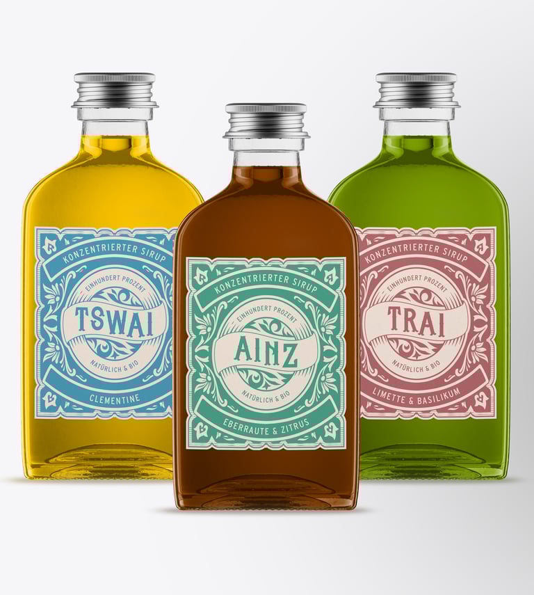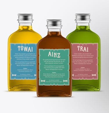 AINZ, TSWAI, and TRAI are the first in an ongoing series of homemade lemonade syrups. These are mixed in the right proportions with sparkling water to create a delicious and natural lemonade. There are now three additional flavors, though they have not yet been added to the portfolio as the recipes are still being refined. The name of the syrups is a play on words in German and simply refers to a numbering system from one to six.